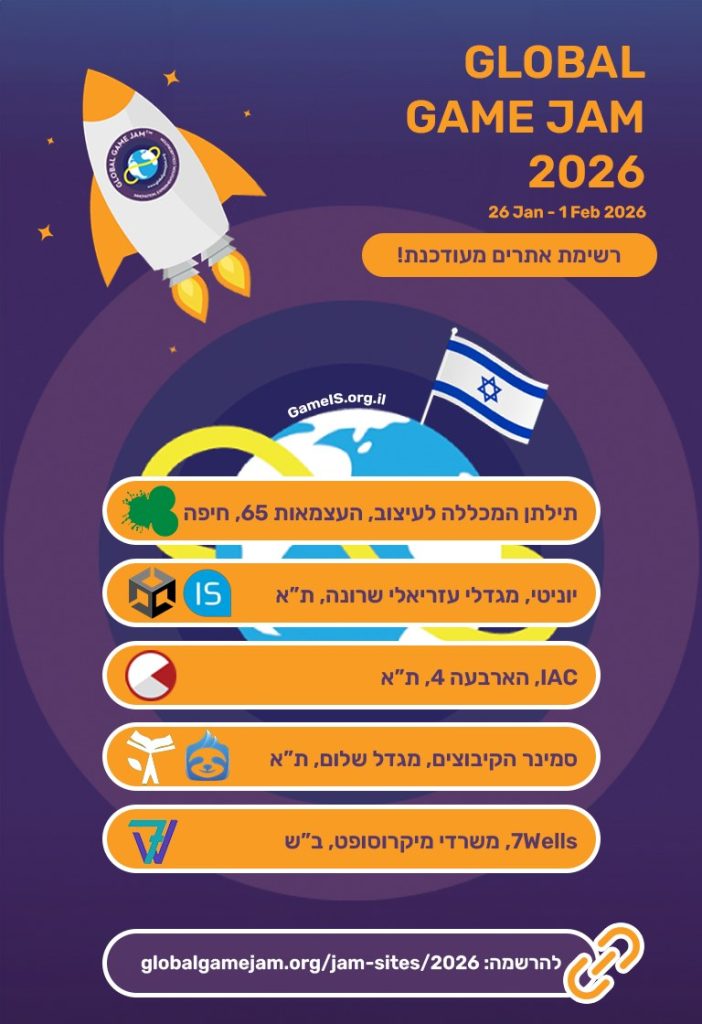 האקתון לפיתוח משחקים שבו מפתחי משחקים מכל העולם נפגשים ל-48 שעות של יצירה משותפת. בין אם אתם מתכנתות, מעצבים, מוזיקאיות, כותבים או פשוט סקרנים – כל אחד יכול להצטרף ולהתנסות בתהליך פיתוח משחקים.